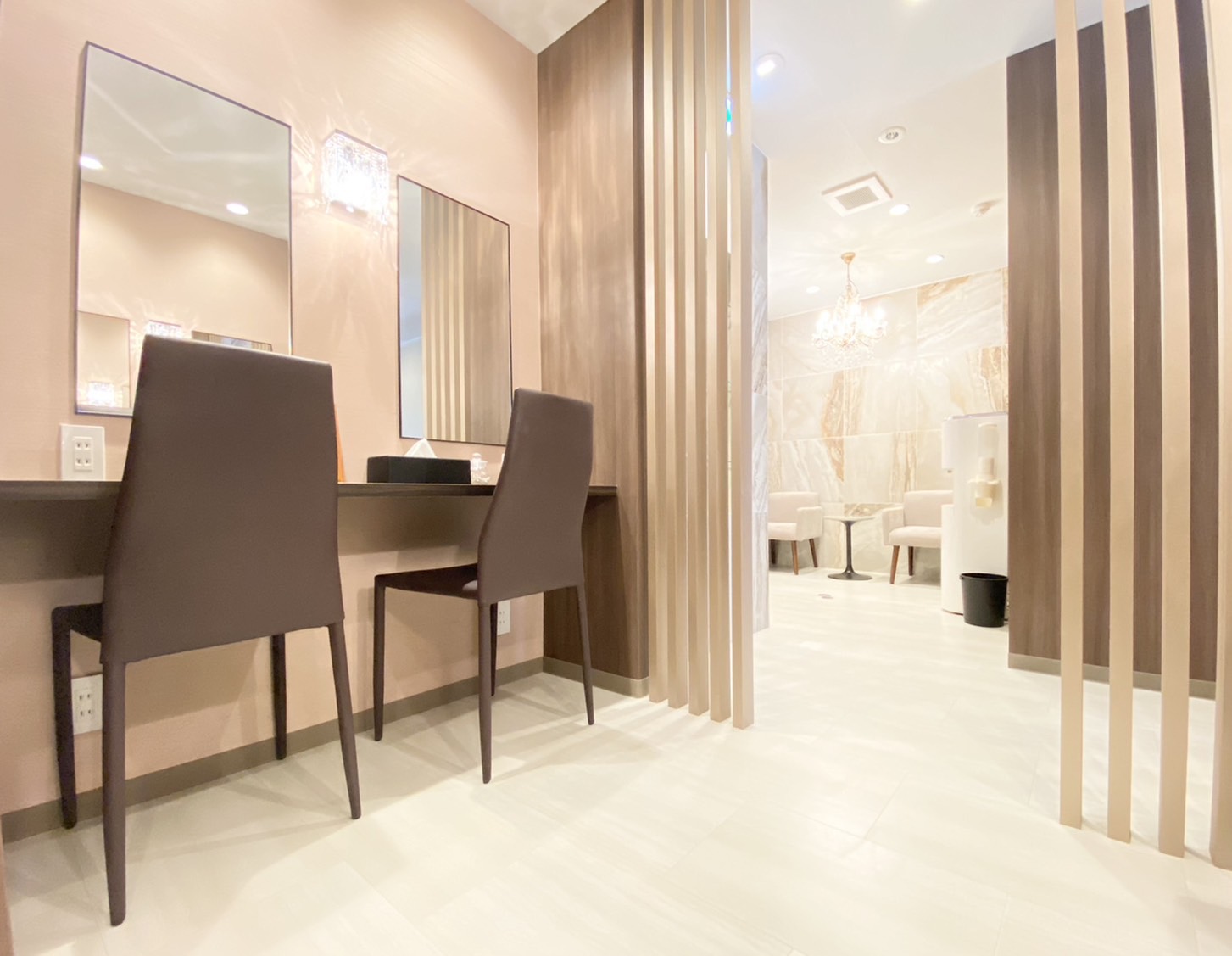 「美しくなりたい」気持ちを高められるような高級感ある空間。施術中は完全個室のリクライニングソファで快適にお過ごしいただけます。